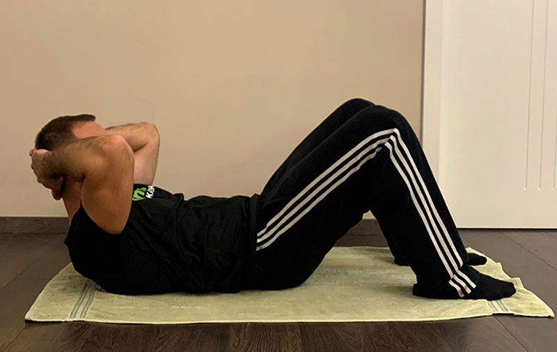 A hasprés segít a hát- és hasizmok erősítésében, a részleges változata pedig kíméli a gerincet. Ehhez feküdj hanyatt behajlított térddel és a talajon nyugvó lábfejjel. Fond keresztbe a karodat a mellkasodon, vagy kulcsold össze a kezed a tarkódnál. Ezután a hasizmaid megfeszítésével együtt emeld fel a vállad a talajról, miközben kifújod a levegőt. Ne könyökből indítsd a mozdulatot, és ne a karoddal próbáld meg felhúzni a nyakad a földről! Tartsd ki a helyzetet egy másodpercig, aztán lassan ereszkedj vissza.